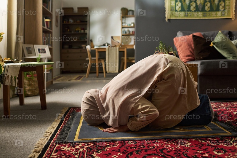 Мусульманка молится на ковре в гостиной днем
