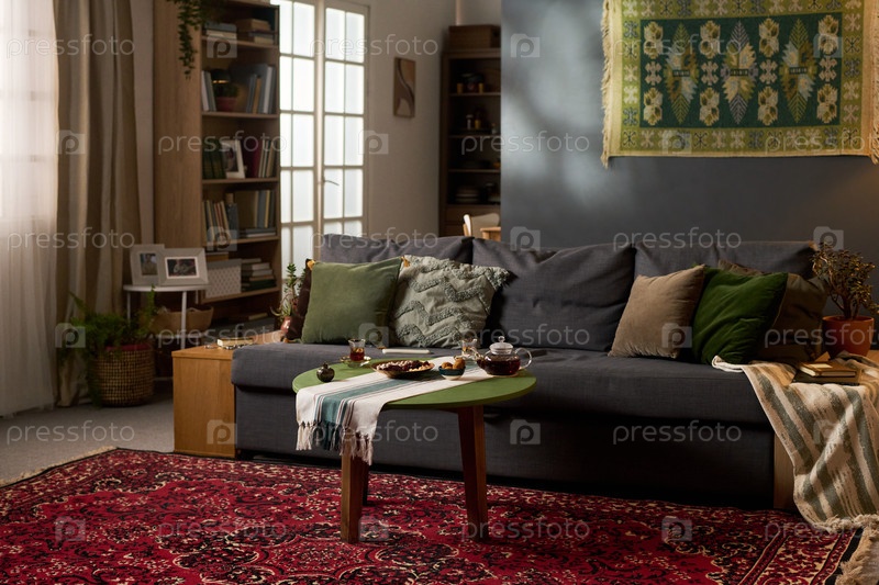 Современная гостиная с традиционным мусульманским декором и рамаданскими угощениями на выставке