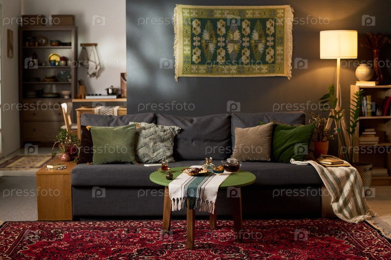Традиционный мусульманский интерьер гостиной с чайным набором и рисунковым ковром