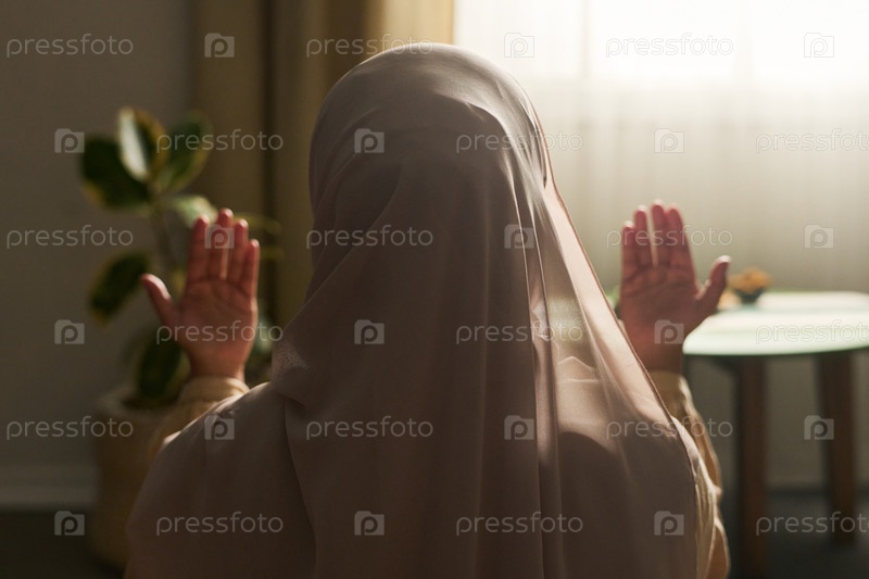 Непризнанная мусульманка молится в помещении с поднятыми руками
