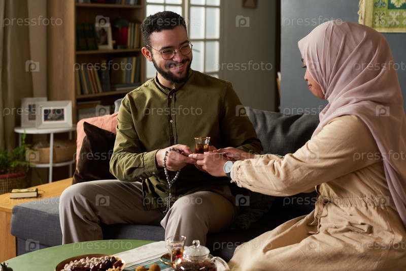 Молодой взрослый мужчина с Ближнего Востока делится чаем с молодой взрослой женщиной из Среднего Востока