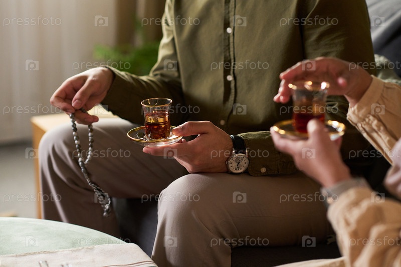 Мужчина-мусульманин держит молитвенные бусы и пьет чай с мусульманкой в помещении