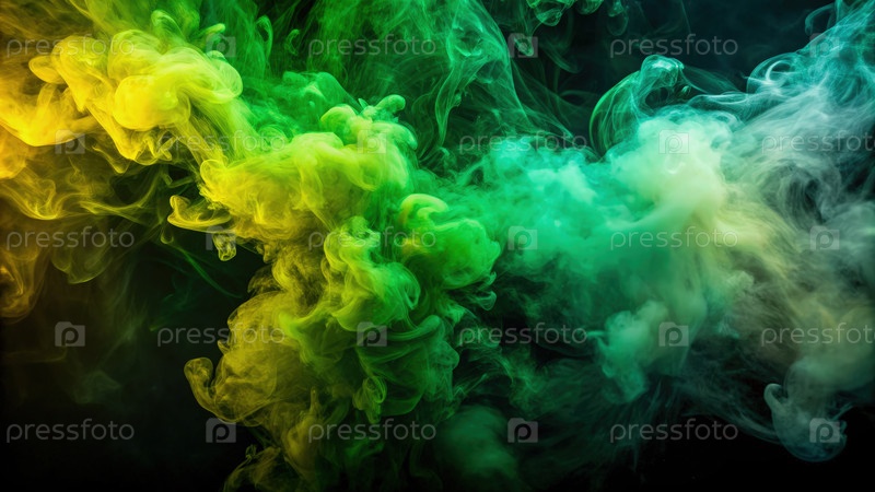 Вибрирующий зеленый и желтый дым вращается на темном фоне
