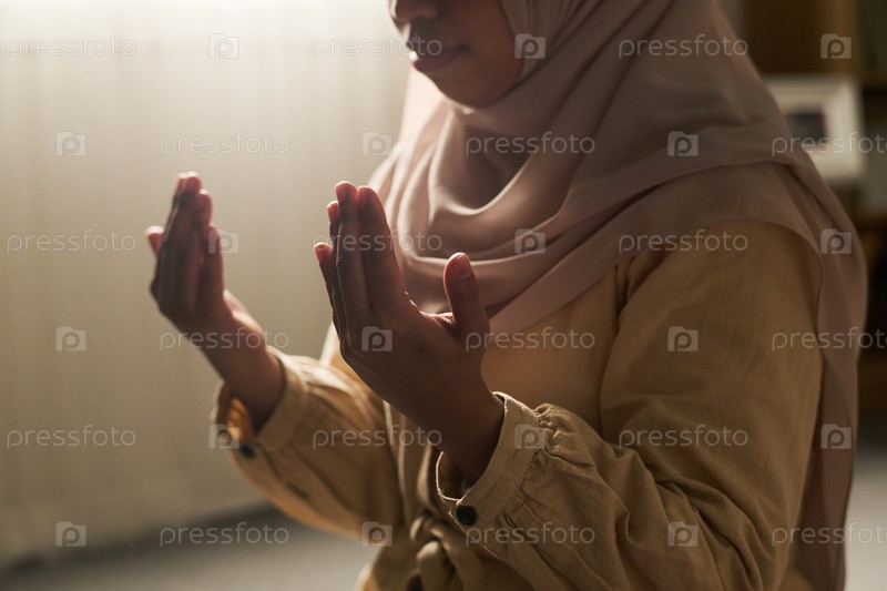 Молодая взрослая мусульманская женщина молится в помещении с поднятыми руками в знак мольбы