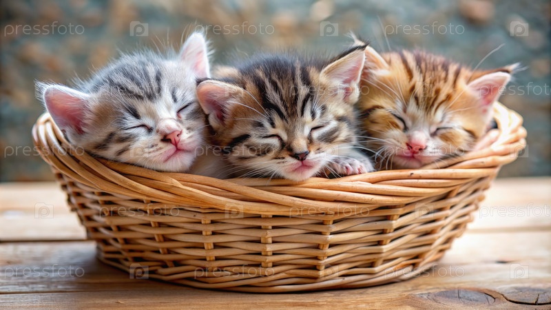 Котятки спокойно спят в плетеновой корзине на уютной деревянной поверхности