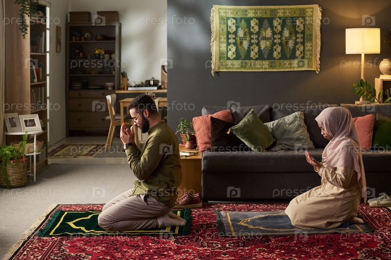 Молодой мусульманин и молодая взрослая мусульманка молятся в помещении вместе