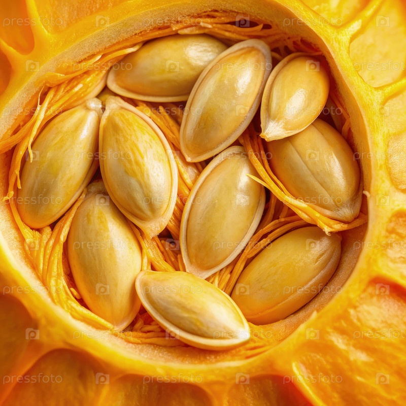 Детальное изображение очищенного ядра семян тыквы внутри тыквы