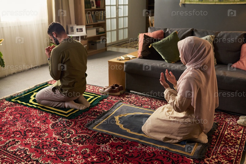 Мусульманский мужчина и женщина молятся вместе на полу в гостиной