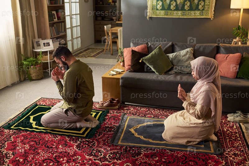 Мусульманский мужчина и женщина молятся вместе в помещении во время Рамадана