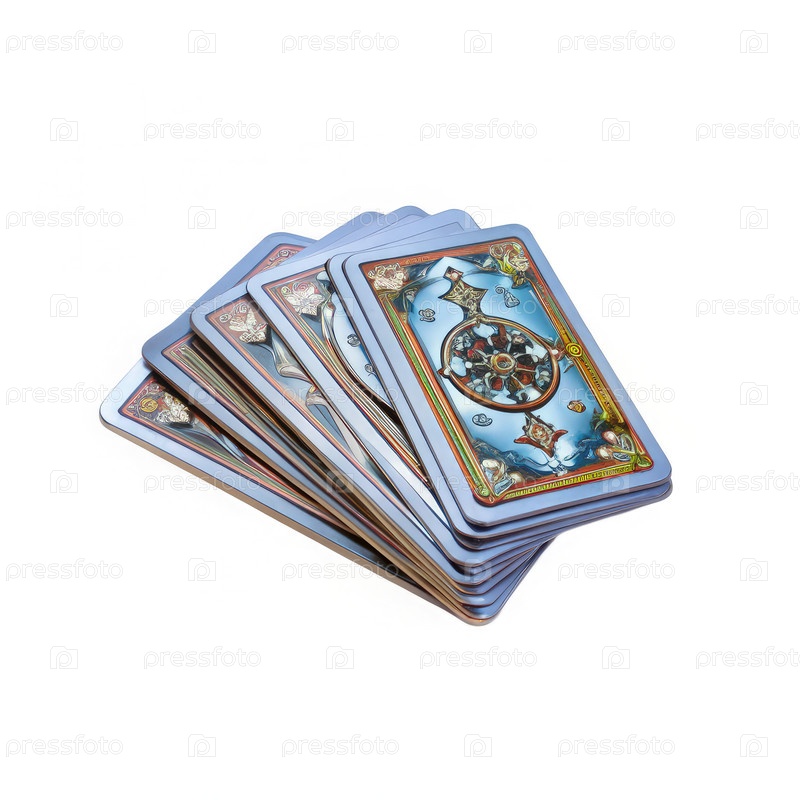 Металлические карточки таро разбросаны на плоской поверхности с сложными рисунками