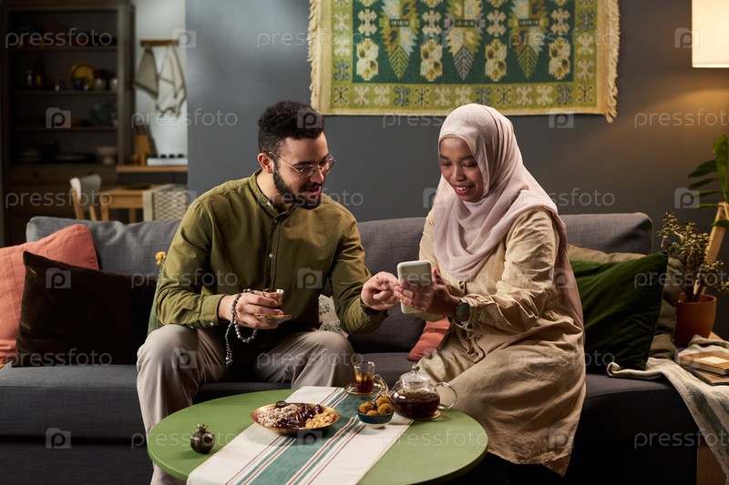 Молодая мусульманская пара сидит вместе, пьет чай и использует смартфон в помещении