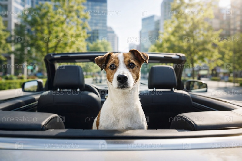 Портрет собаки Джек Рассел Терьера на заднем сидении кабриолета в городе летом