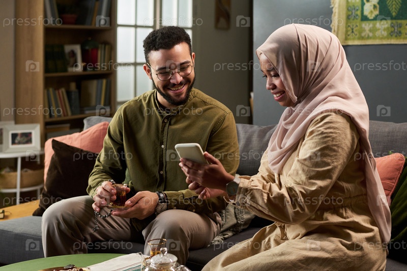 Молодая мусульманка показывает смартфон улыбающемуся молодому мужчине в помещении