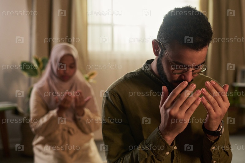 Молодой мусульманский мужчина и женщина молятся в помещении во время религиозного праздника