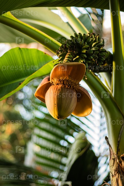 Большой план бананового цветка на бананном дереве с золотыми прицветаниями и гроздьями незрелых плодов.На заднем плане пышные тропические листья с мягким эффектом боке