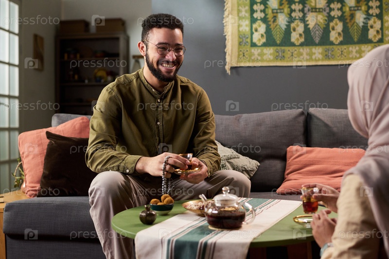 Молодой взрослый мужчина с Ближнего Востока улыбается, выпивая чай с мусульманской женщиной