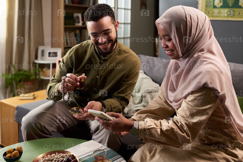 Молодой мусульманский мужчина и женщина пьют чай и используют смартфон вместе в помещении