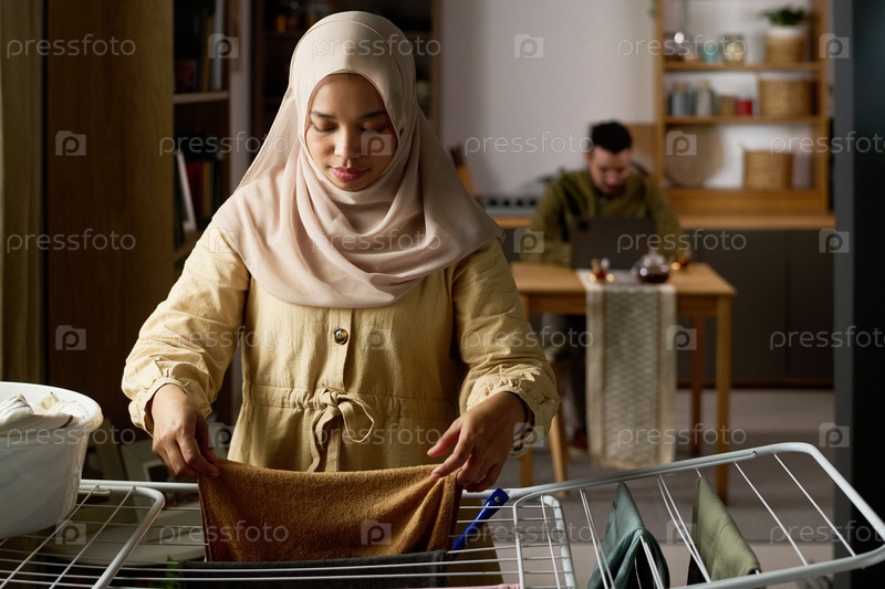 Молодая взрослая мусульманка вешает бельё в помещении, а мужчина работает на заднем плане