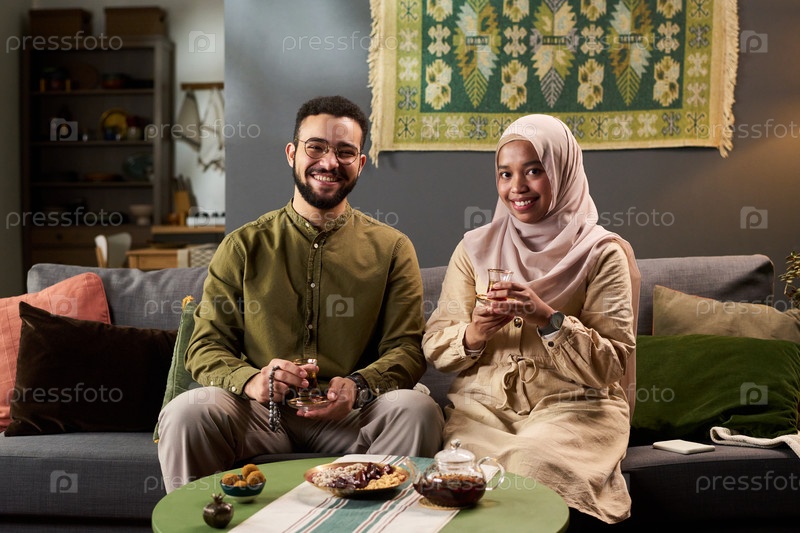 Портрет молодого взрослого мусульманского мужчины и женщины, улыбающихся во время питья чая в помещении