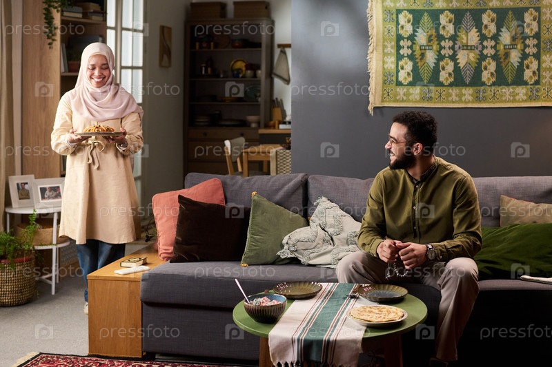 Молодая мусульманка приносит еду, в то время как бородатый мужчина сидит на диване