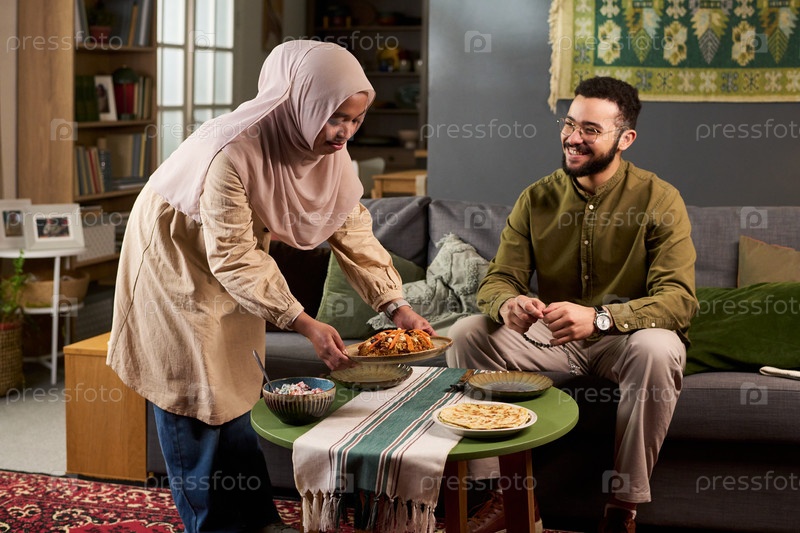Молодая мусульманка подает еду молодому взрослому мужчине-мусульманину в помещении