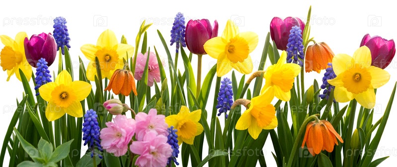 Яркая палитра весны: нарциссы и весенние цветы. На белом фоне