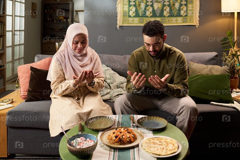 Молодая мусульманка и мужчина молятся перед едой традиционной пищи в помещении