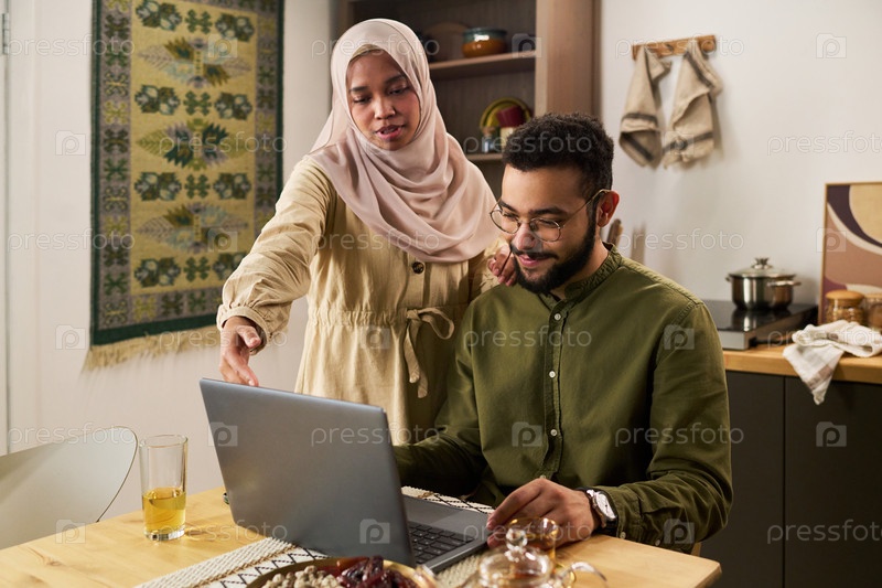 Молодая мусульманка объясняет проект молодому мужчине, использующему ноутбук в помещении