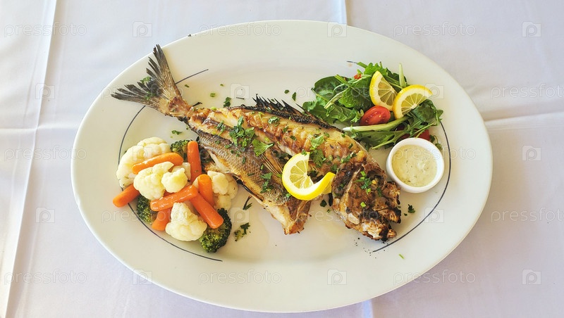Зажаренная рыба дорадо с овощами, свежим салата и лимоном на белой тарелке. Вкусная и здоровая еда как для детей, так и для взрослых. Диетическое блюдо. Наряду с рыбой подают жареные овощи