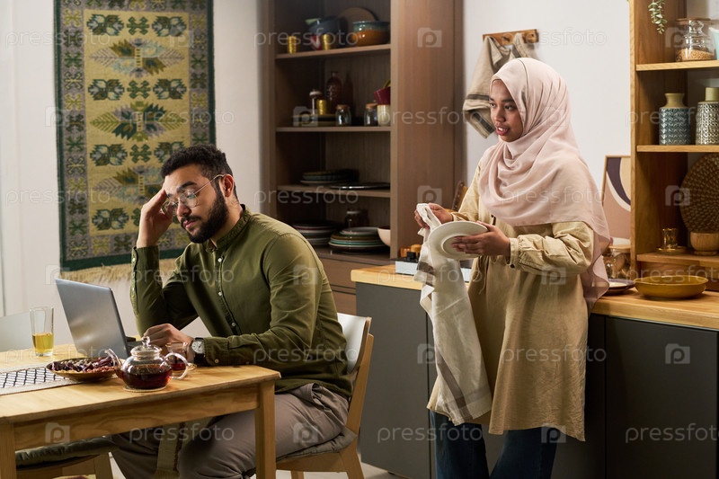 Молодой мусульманин работает на ноутбуке, в то время как молодая мусульманка моет посуду