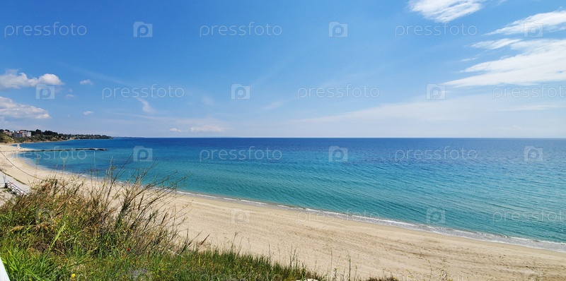 Красивый морской пейзаж. чистая, прозрачная бирюзовая вода и маленькие волны под голубым небом. галечный или песчаный пляж для летних каникул. место назначения для путешествий во время отпуска или отпусков. рай на земле