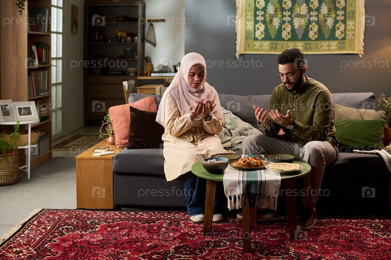 Молодой мусульманский мужчина и женщина молятся вместе в помещении перед едой