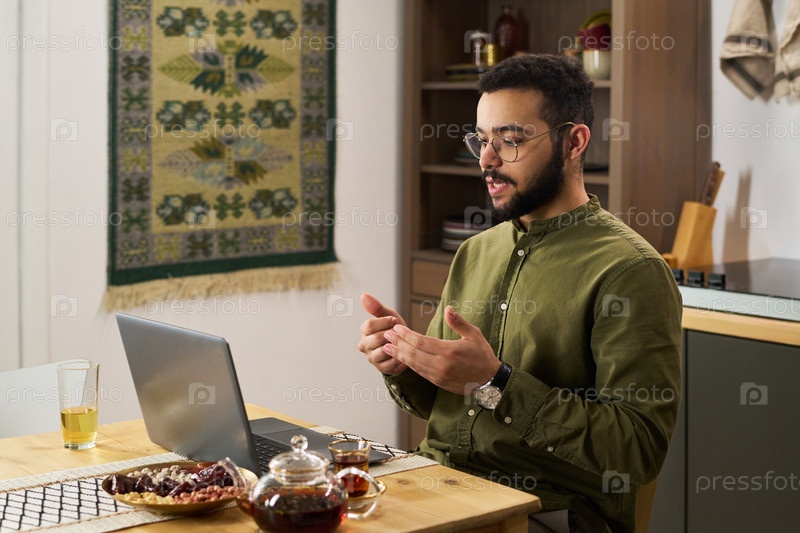 Молодой взрослый ближневосточный мужчина молится, сидя за столом с ноутбуком