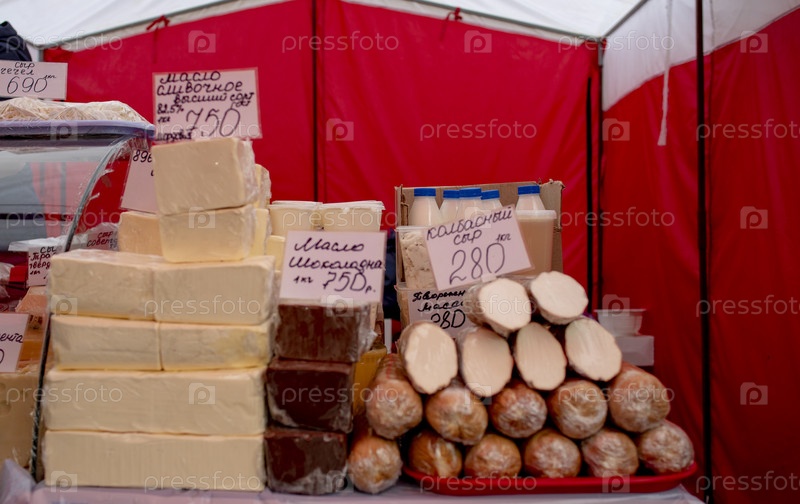 Лоток с сыром и маслом на рынке. Москва