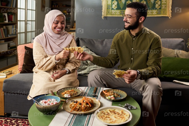 Молодая мусульманка и молодой мужчина-мусульманин делятся едой и улыбаются вместе