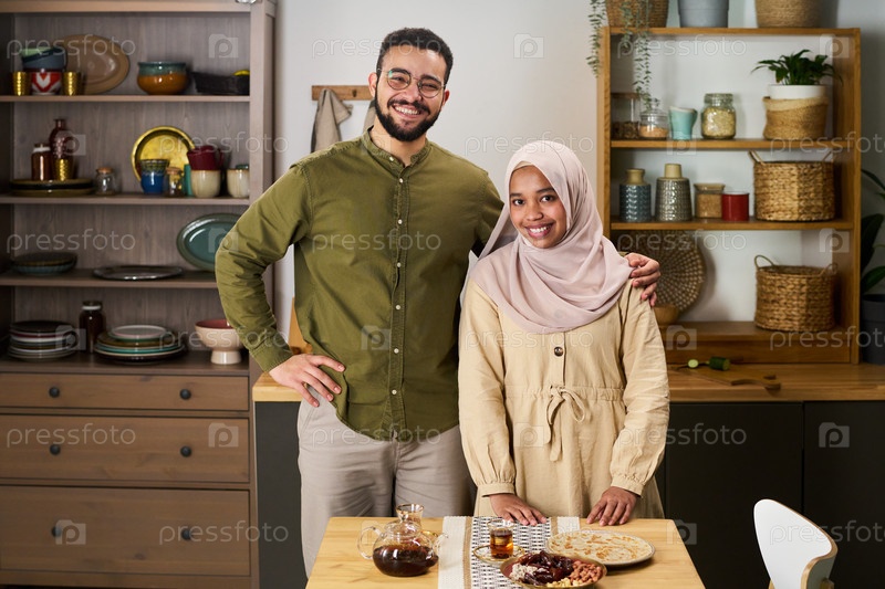 Портрет молодого взрослого мусульманского мужчины и женщины, улыбающихся вместе на кухне