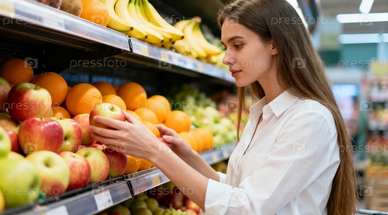 Женщина осматривает яблоки во время покупок в продуктовом магазине. Она стоит перед дисплеем, наполненным различными фруктами и овощами. Это день, а магазин яркий Generative AI