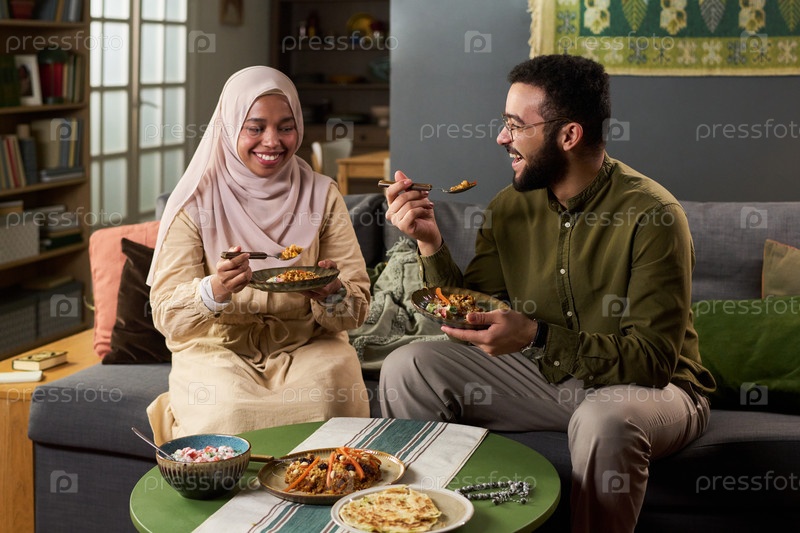 Молодая мусульманка и молодой мужчина-мусульманин наслаждаются обедом вместе в помещении