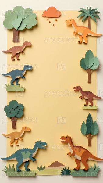 Цветные вырезки динозавров окружают пустое пространство на бумаге.Каждый динозавр имеет различные цвета и позы.Деревья, облака и гора добавляют к игривой сцене для детей Генеративный ИИ