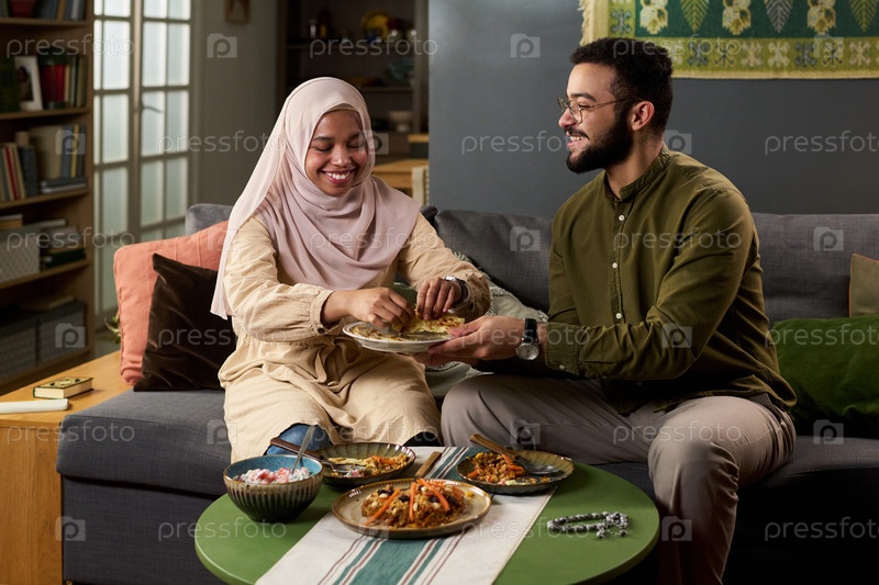 Молодая взрослая мусульманская женщина и мужчина смеются, делясь традиционной едой в помещении