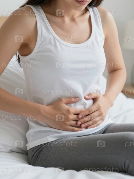 Женщина сидит на кровати, держа желудок и проявляет признаки дискомфорта.Она может иметь дело с болью в животе и метеоризмом, связанными со своим менструальным циклом Generative AI