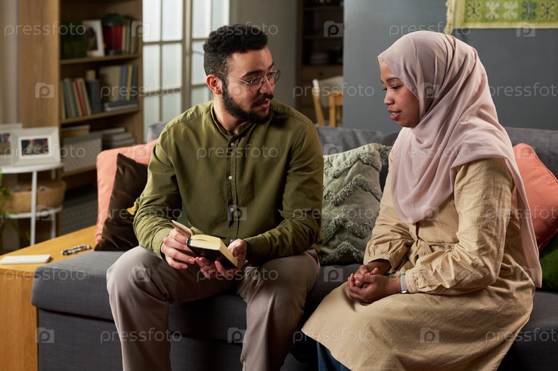 Молодой взрослый мусульманин объясняет книгу молодой взрослой мусульманке в помещении