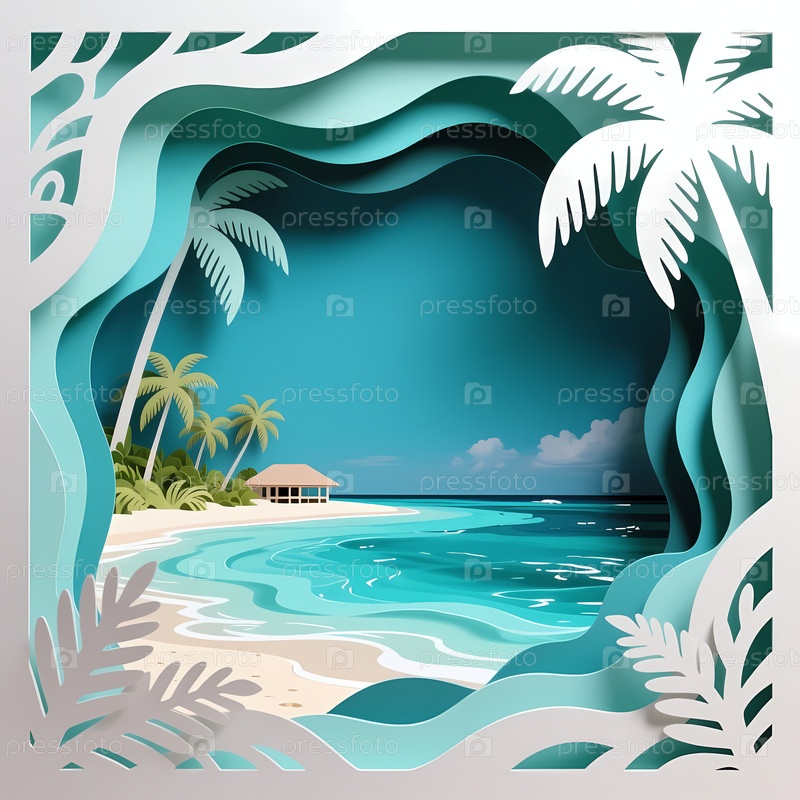 Сцена показывает пляж с чистыми волнами и зелеными пальмами рядом с уютной структурой на берегу под ярким небом, заполненным облаками Generative AI