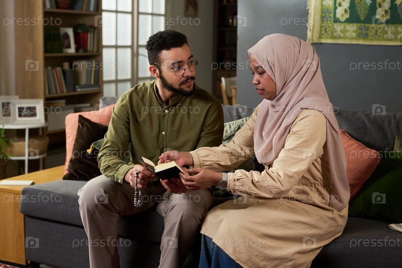 Молодой мусульманский мужчина и женщина читают религиозную книгу и молятся вместе в помещении