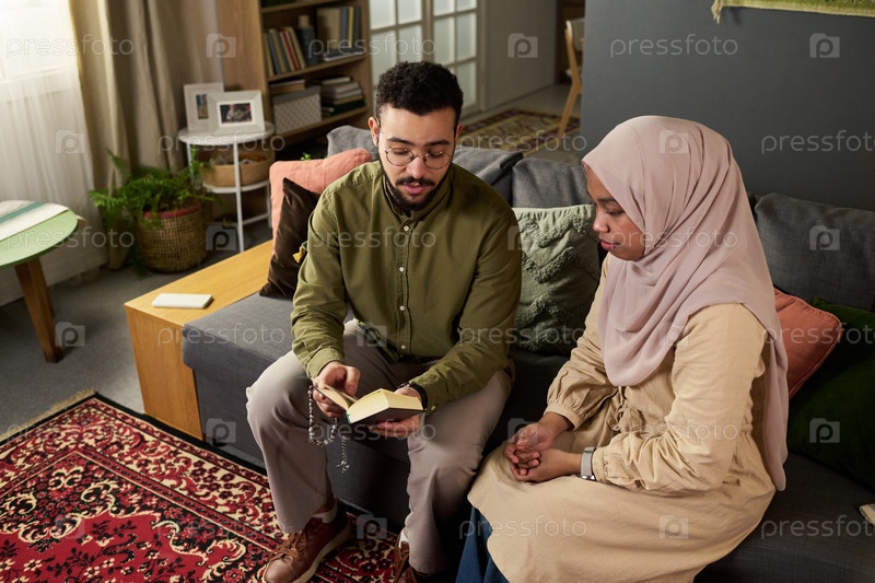 Молодой мусульманин читает религиозную книгу молодой женщине-мусульманке в помещении