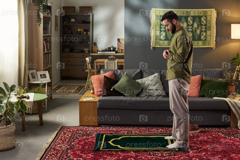 Молодой мужчина с Ближнего Востока молится в помещении, демонстрируя мусульманскую веру