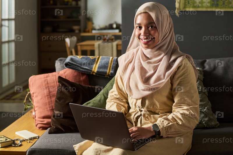 Портрет молодой взрослой мусульманской женщины, улыбающейся во время использования ноутбука в помещении