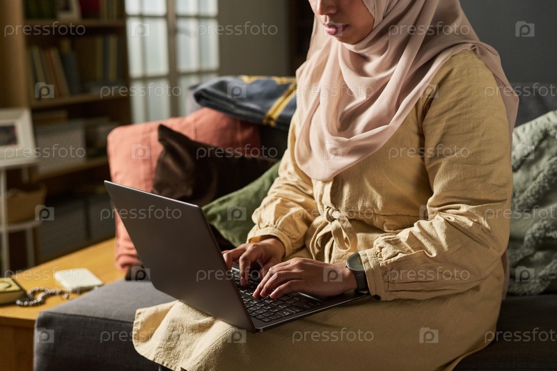 Молодая взрослая мусульманская женщина использует ноутбук, сидя в помещении на диване