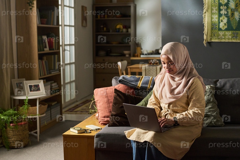 Молодая взрослая мусульманка, сидящая на диване и работающая удаленно с ноутбуком в помещении