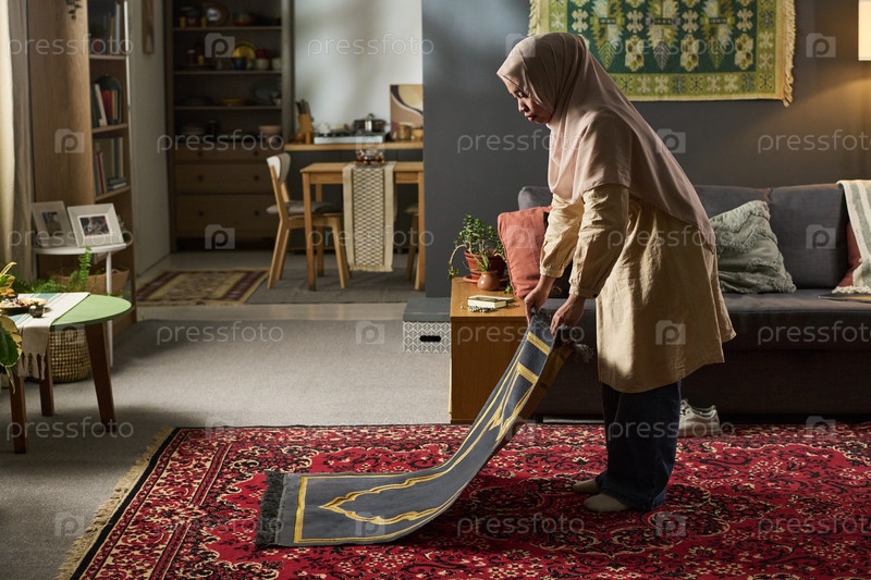 Молодая мусульманка готовит молитвенный ковер в гостиной дома